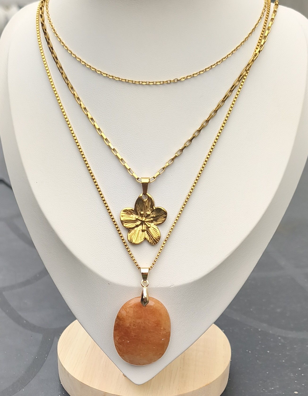 Collier Triple Chaîne en Acier Inoxydable 316 Dorée et un pendentif en AGATE MOUSSE ORANGE