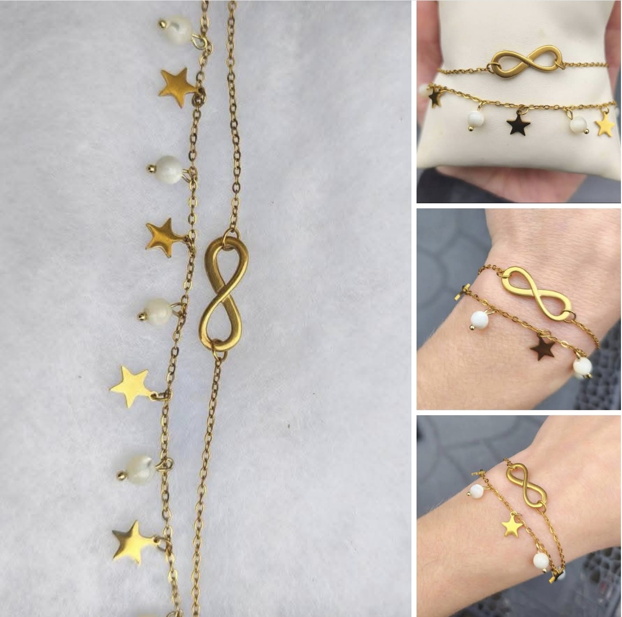 Bracelet Double Chaîne en Acier Inoxydable 304 SYMBOLE INFINI et NACRE BLANC NATUREL 💖